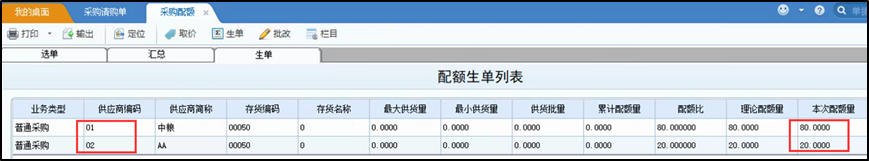 举例:存货00050,供应商01:配额80%;供应商02:配额20%;