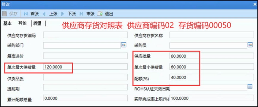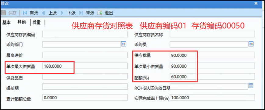 2、在供应商存货对照表中维护配额相关参数