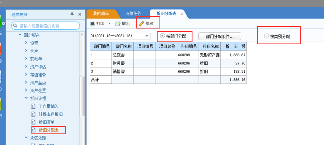 4. 计提本月折旧,若卡片上维护了固定资产对应折旧科目,但计提本月折旧生成的凭证没有带出折旧科目时,可以在折旧分配表里点修改切换按部门按类别分配,让数据刷新一下。