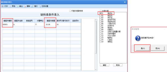 2.3缺料表选择配套件A,数量为10,勾选有现存量和可用量的仓库,不勾选只显示短缺存货,是否展开到末级为否,进行查询