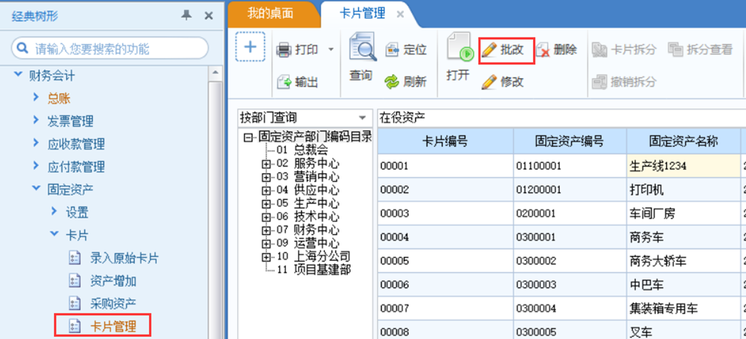 实际资产业务中,可能会出现部分卡片上的某些信息填写错误而需要修改,可以通过卡片批改的方式统一对卡片的信息进行修改。
