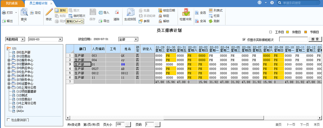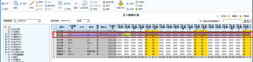 可以根据考勤人员里的排班方式、默认班次和休息日方案自动生成排班,或通过excel维护数据导入,或复制其他人员排班,也支持手工调整排班计划和锁定排班计划不让修改。