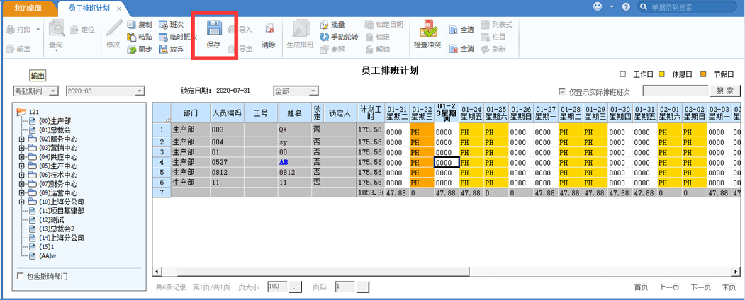 4、导入后,员工排班计划里只显示excel里维护的人员,此时必须点“保存”,导入的内容才会生效,这个界面也支持右键选择班次,手工调整排班。