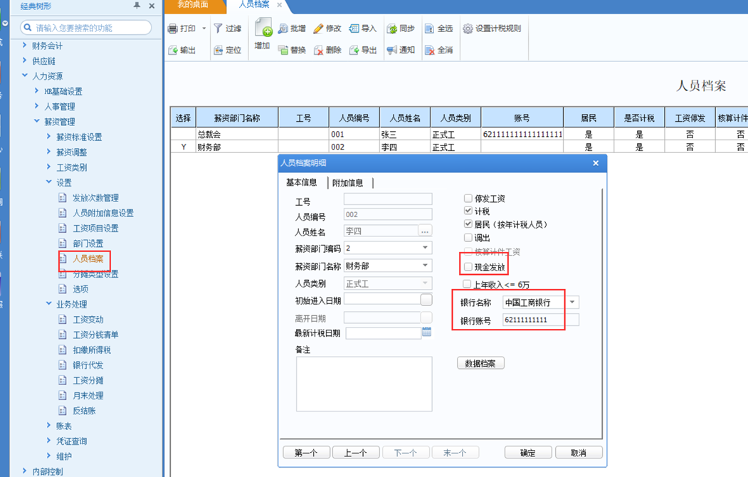 3.1人员档案选中人员点修改,若为现金发放打上勾,否则为银行发放,选择银行名称,维护银行账号信息。