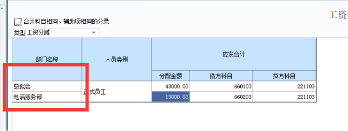 6. 生成的凭证科目相同,辅助项相同的分录需要合并,可以勾选工资分摊一览表的合并科目相同,辅助项相同的分录