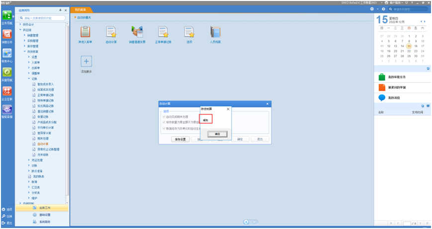 1.2点击存货核算节点下的自动结算按钮,提示成功;