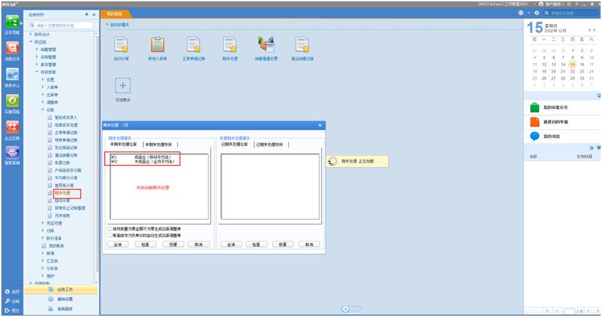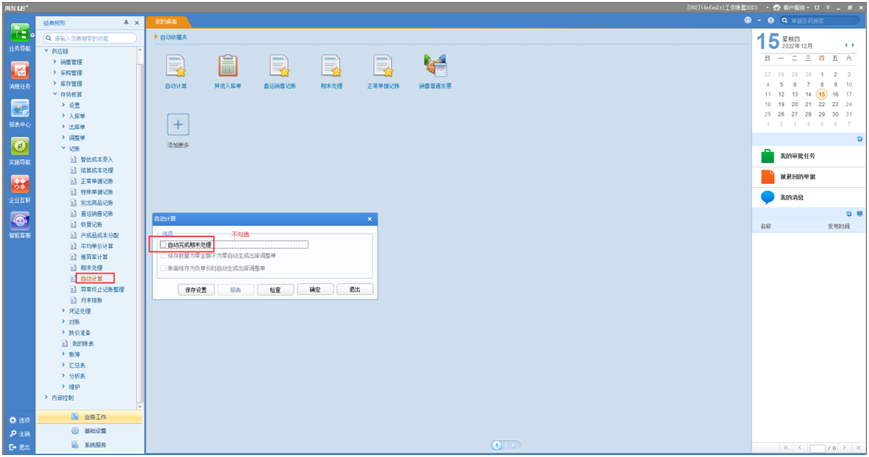 2.2 自动计算界面下勾选自动完成期末处理,存货核算会自动期末处理,反之,不勾选自动完成期末处理,则不会自动期末处理;