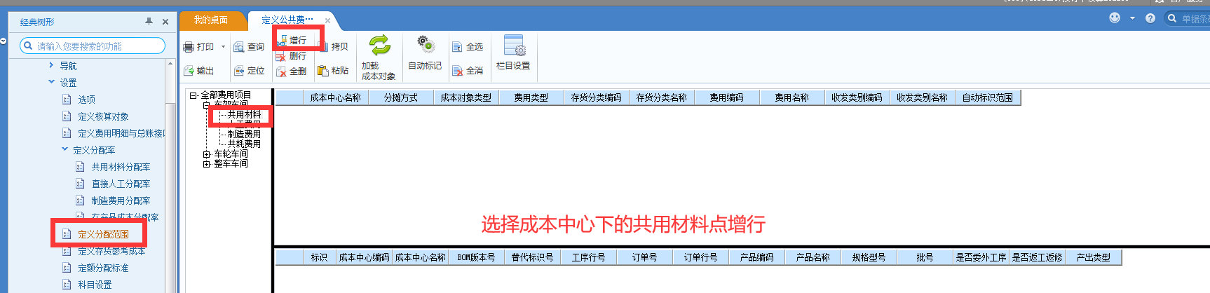 1、选择成本中心下的共用材料点增行(以共用材料为例,其他同理)