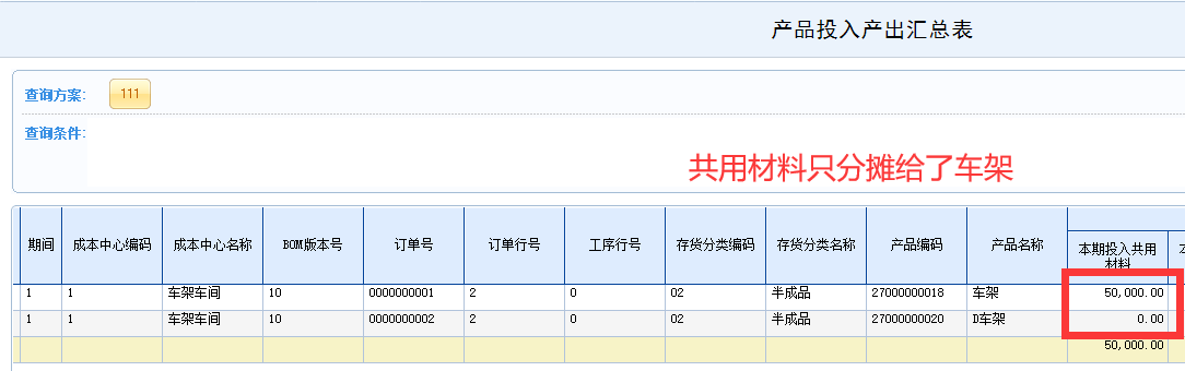 车架车间的共用材料只分摊给产品车架,D车架不分摊共用材料