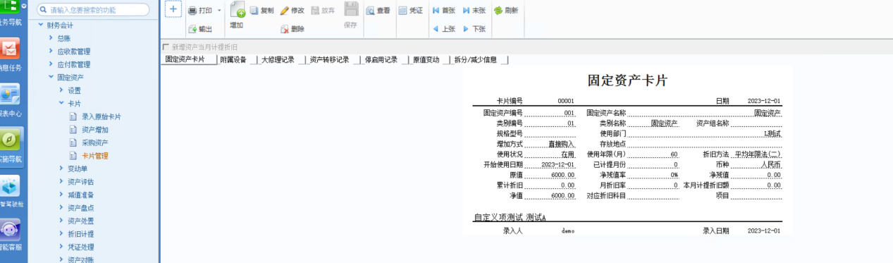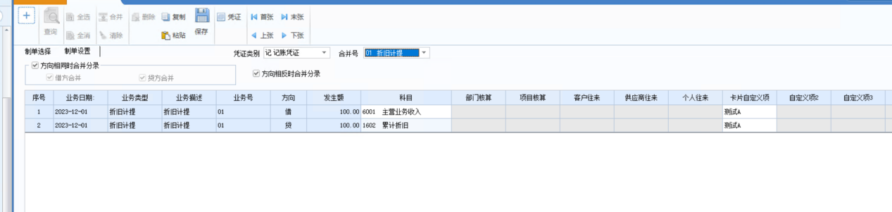 2、新增凭证、变动单、计提折旧,累计折旧科目、费用科目、固定资产科目均会自动带出自定义项。