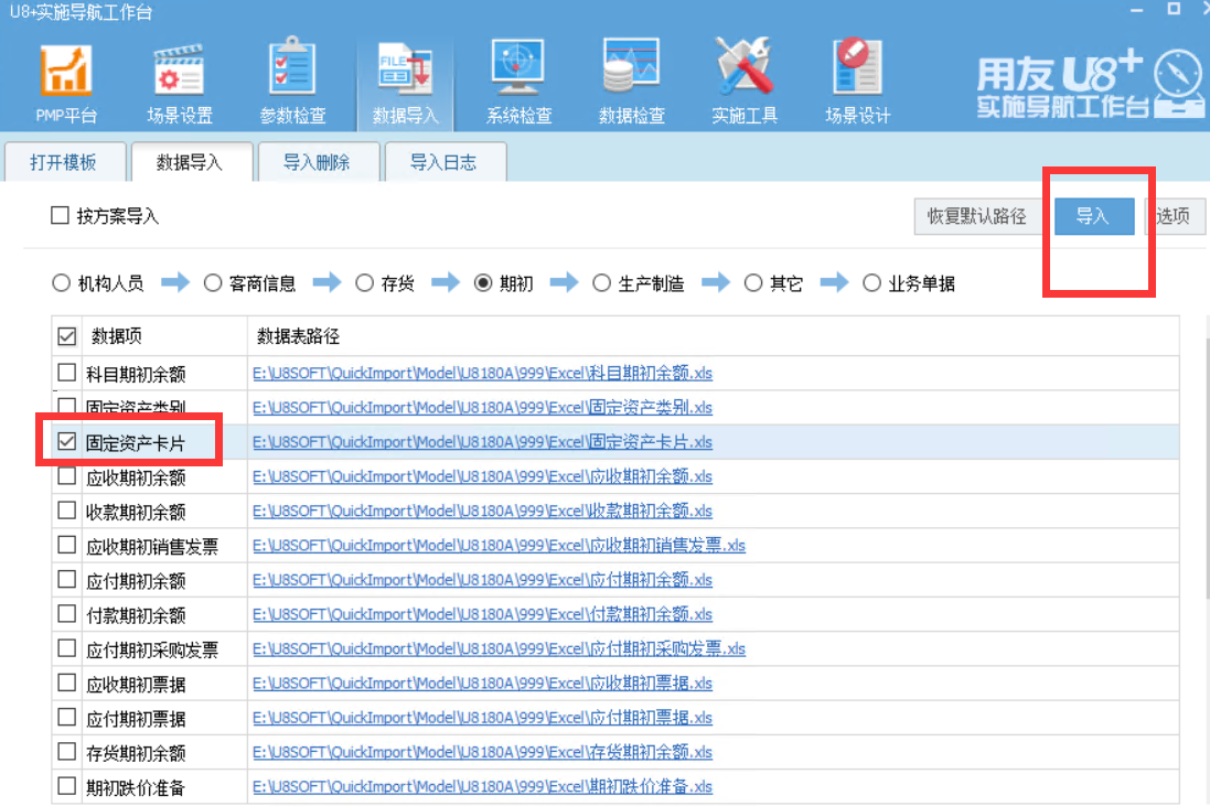 5、实施导航中点击数据导入,勾选“固定资产卡片”,点击导入