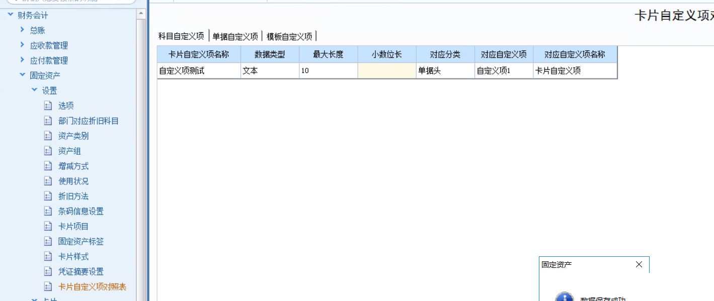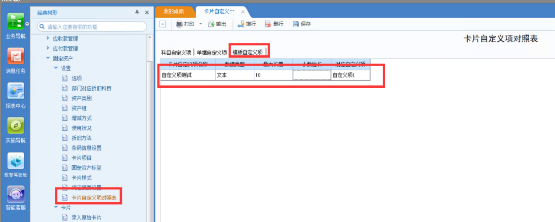 1、在【卡片自定义项对照表】中,在【模板自定义项】中将增加的【自定义项】对应卡片模板的【自定义项】,然后到实施导航中,打开固定资产卡片模板,维护相关数据 “自定义项1”进行导入即可