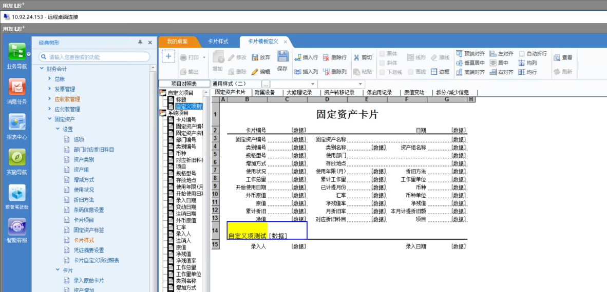 4、在实施导航中,打开固定资产卡片模板,维护相关数据 “自定义项1”