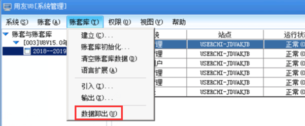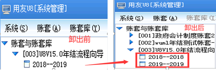 7、 卸出前后系统管理对比:如2018-2019账套库,卸出2018年度后,2018年剥离为单独一个账套库: