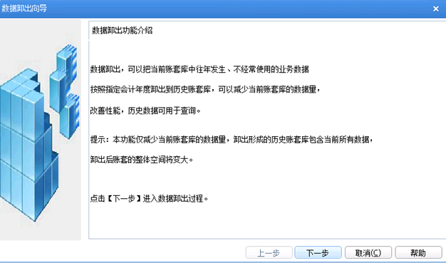 为缓解连续多年数据造成的账套库过大产生的使用效率下降,系统提供数据卸出功能,支持把历史年度数据通过数据卸出剥离出去,提高当前运行的账套库使用效率。