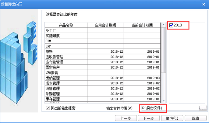 如:账套库年度为2018-2019,最新年度为2019年,此时卸出只能卸出2018年。