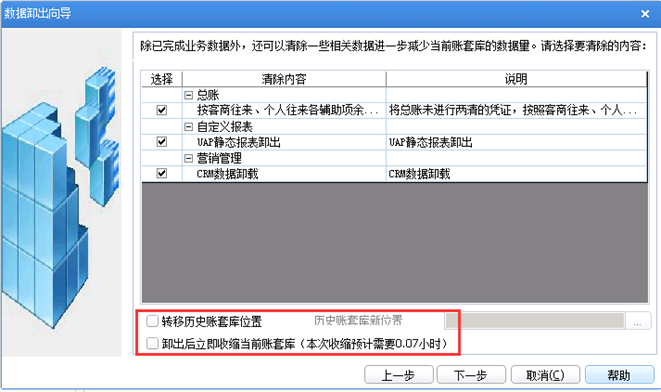 1、 可选择性勾选清楚数据,减少当前账套库数据量;