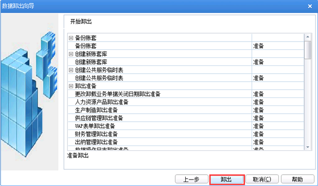 使用账套主管登陆【系统管理】,选择账套进入后,点击【账套库】-【数据卸出】,根据卸出向导依次进入下一步操作。
