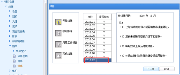 4)总账模块,如卸出之前,总账19年没有结账,卸出后可登录18年恢复18年12月份月结: