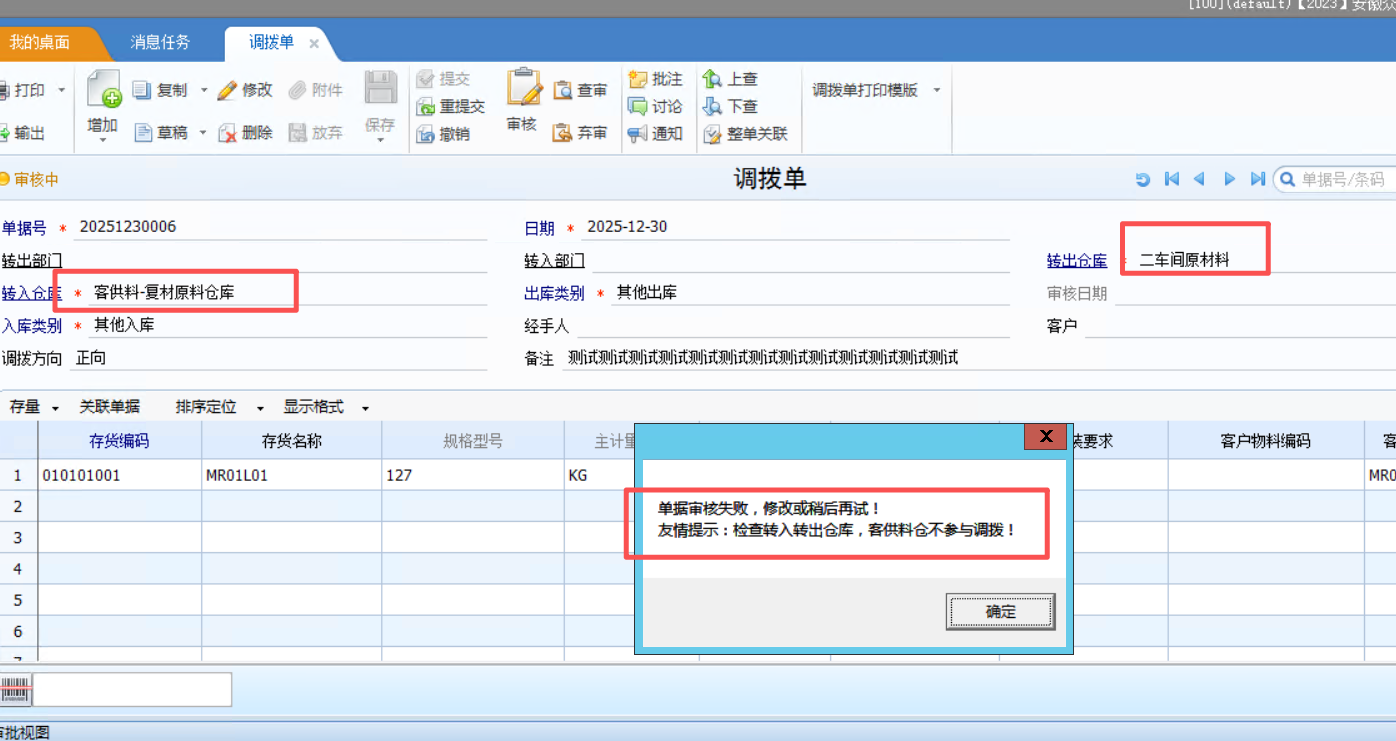 通过在调拨单主表建立触发器,识别到客供仓,自动禁止审核并进行提示
