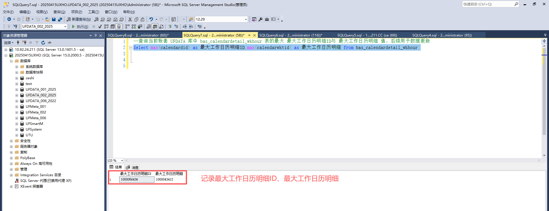 1、第一步:查询当前账套 UFDATA 库中 bas_calendardetail_wkhour 表的最大最大工作日历明细ID与 最大工作日历明细 值,后续用于数据更新