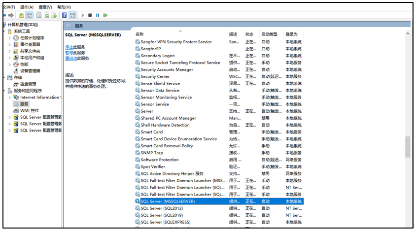 1.依次点击桌面【我的电脑】图标-鼠标右键【管理】-【服务和应用程序】-【服务】重启数据库服务,如下图所示,名称为sql server,括号里的mssqlserver指的是数据库实例名称。根据T+软件链接的数据库实例,重启相应的数据库服务。