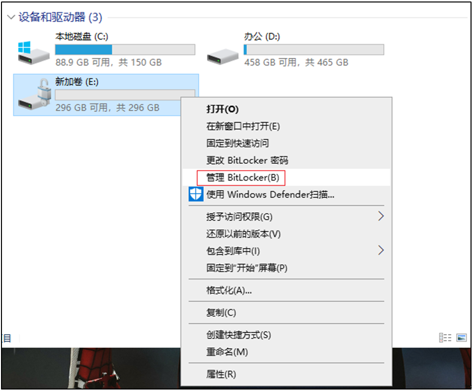 2.2右击要解密的磁盘,打开的菜单项中,选择管理 BitLocker(B);