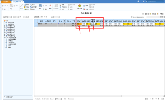 选择同步整体休息日方案,则排班计划里2020-01-01底色变成法定节假日的橙色但班次还是0000、2020-01-03底色变成休息日的黄色但班次还是0000、2020-01-04底色变成工作日的白色但班次还是PH