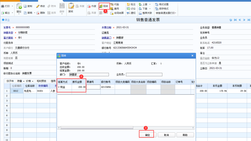 1)对销售发票做现结,在弹出的现结窗口中维护结算方式;
