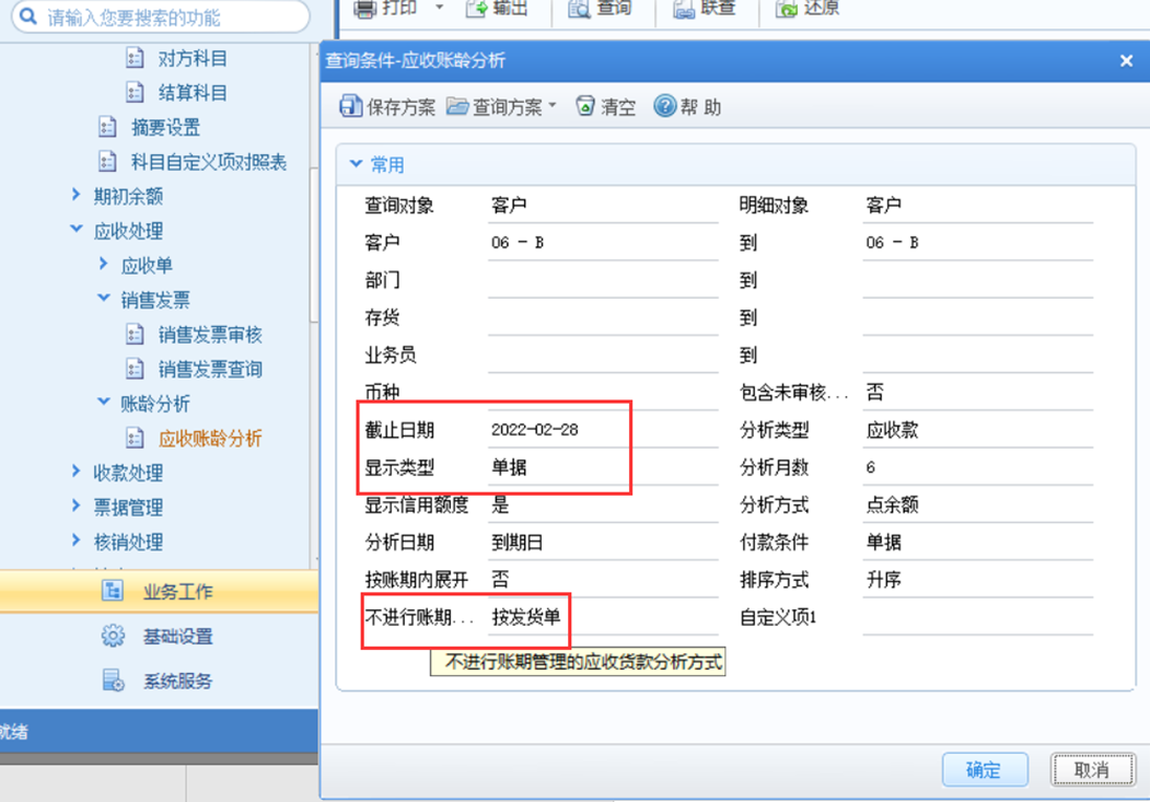 有的发货单是立账依据,有的发货单不是,有的发货单已开发票或部分开票,应收账龄分析查询条件中不进行账期管理的应收货款分析方式不同条件查询出的效果怎样。